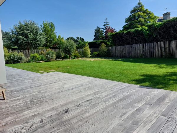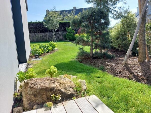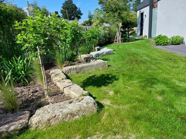 Clôtures en ganivelle, massifs en granit et robot de tonte pour un entretien sans souci