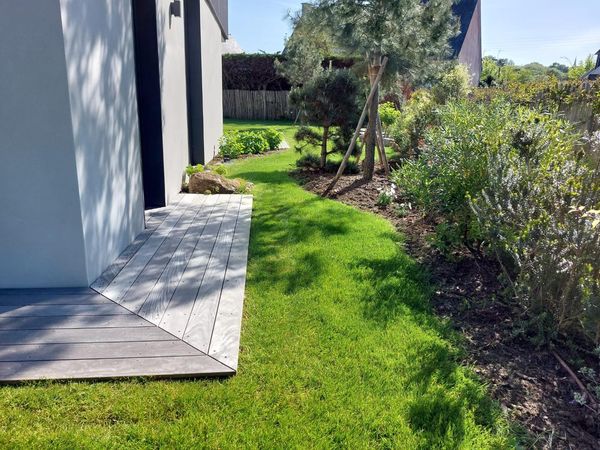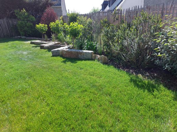 Parcourez notre galerie de photos pour découvrir l'une de nos dernières réalisations. Nous avons créé des clôtures en ganivelle qui apportent une touche naturelle à votre espace extérieur, accompagnées de massifs délimités par des blocs en granit pour un aspect élégant. De plus, nous avons aménagé une placette avec des pas japonais bordés de joints gazon, et installé un robot de tonte pour un entretien facile et régulier tout au long de l'année. Faites confiance à Protea pour transformer votre extérieur en un véritable paradis.