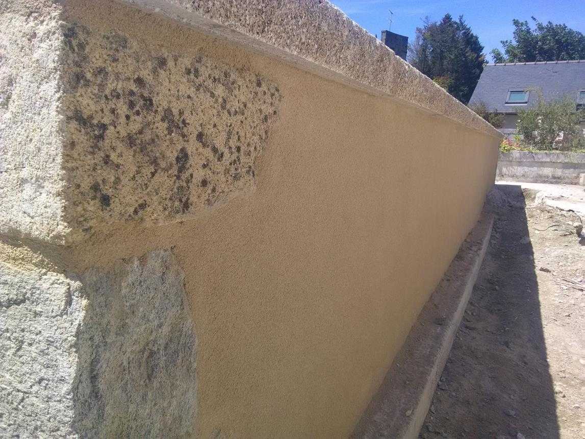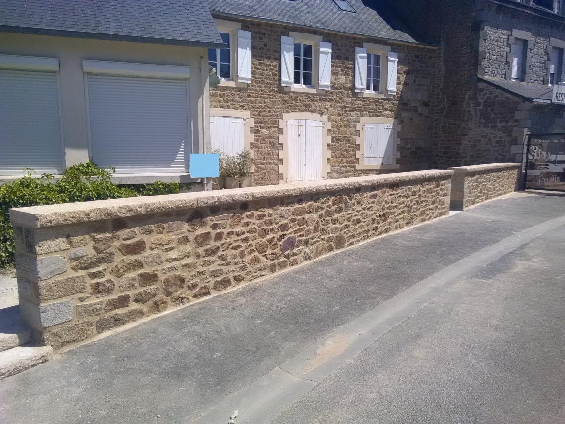 Muret maçonné en parement pierre en façade et un enduit grain fin ocre à l’arrière. Le couronnement est en granit beige bouchardé de 10 cm d’épaisseur.