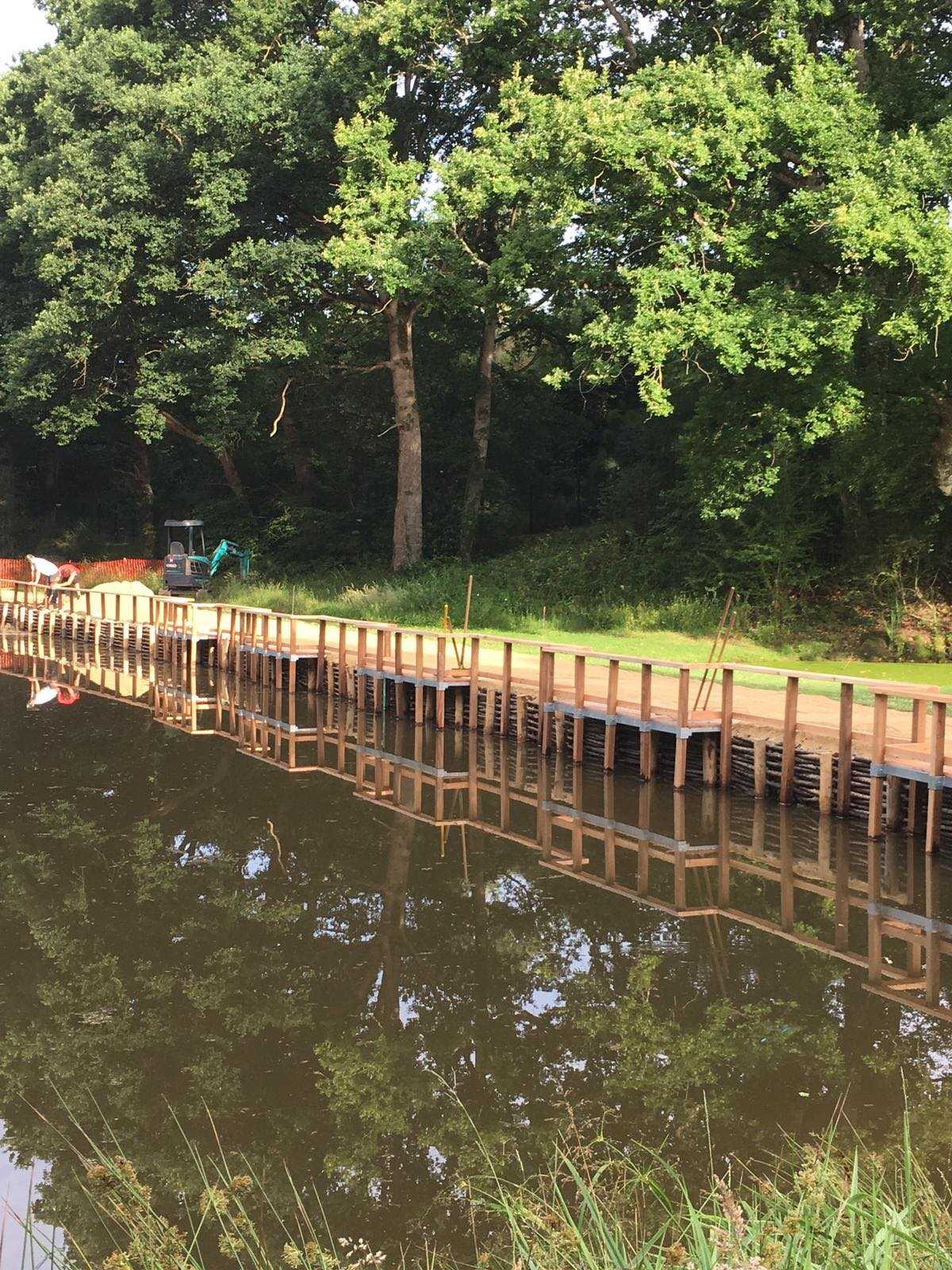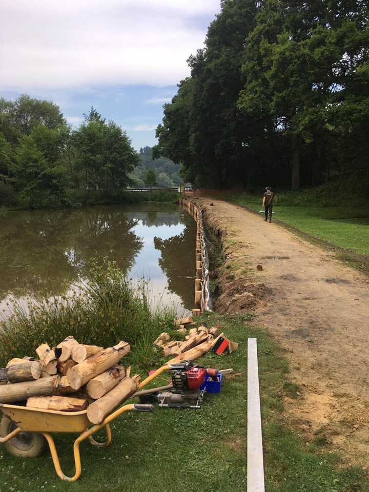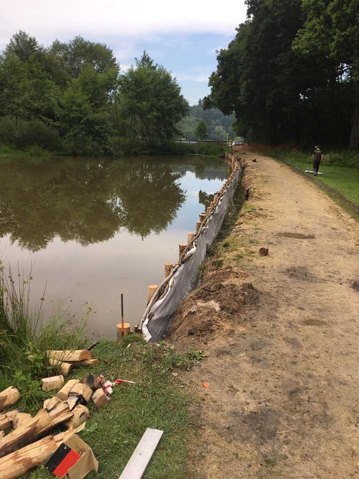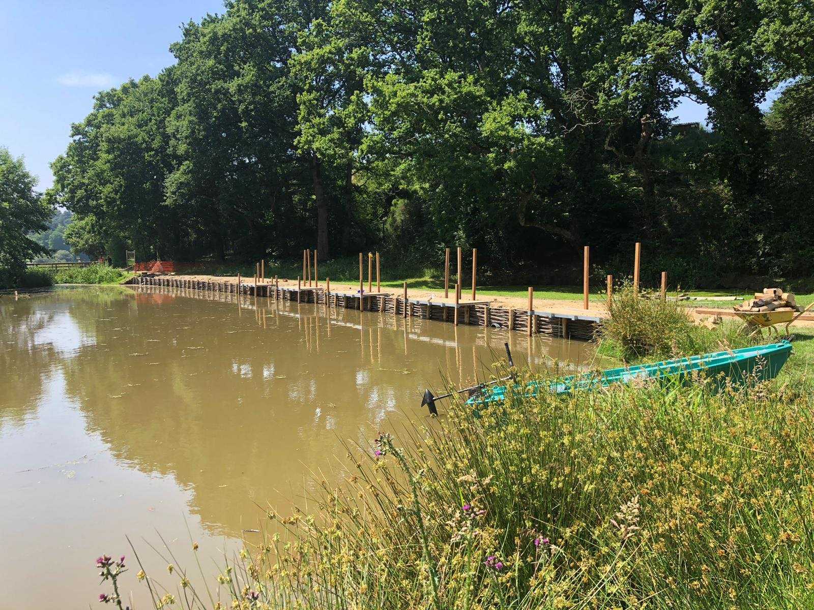 Les équipes travaillent sur le renforcement des berges pour soutenir les abords de l'étang.