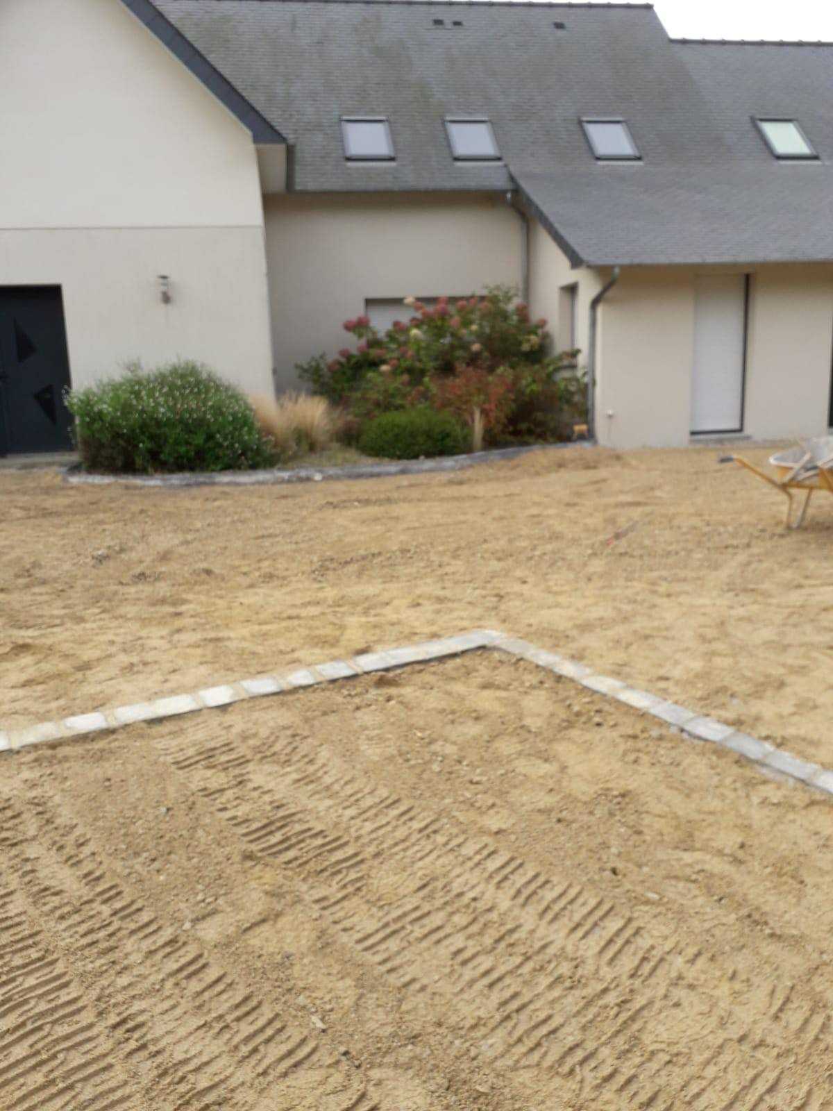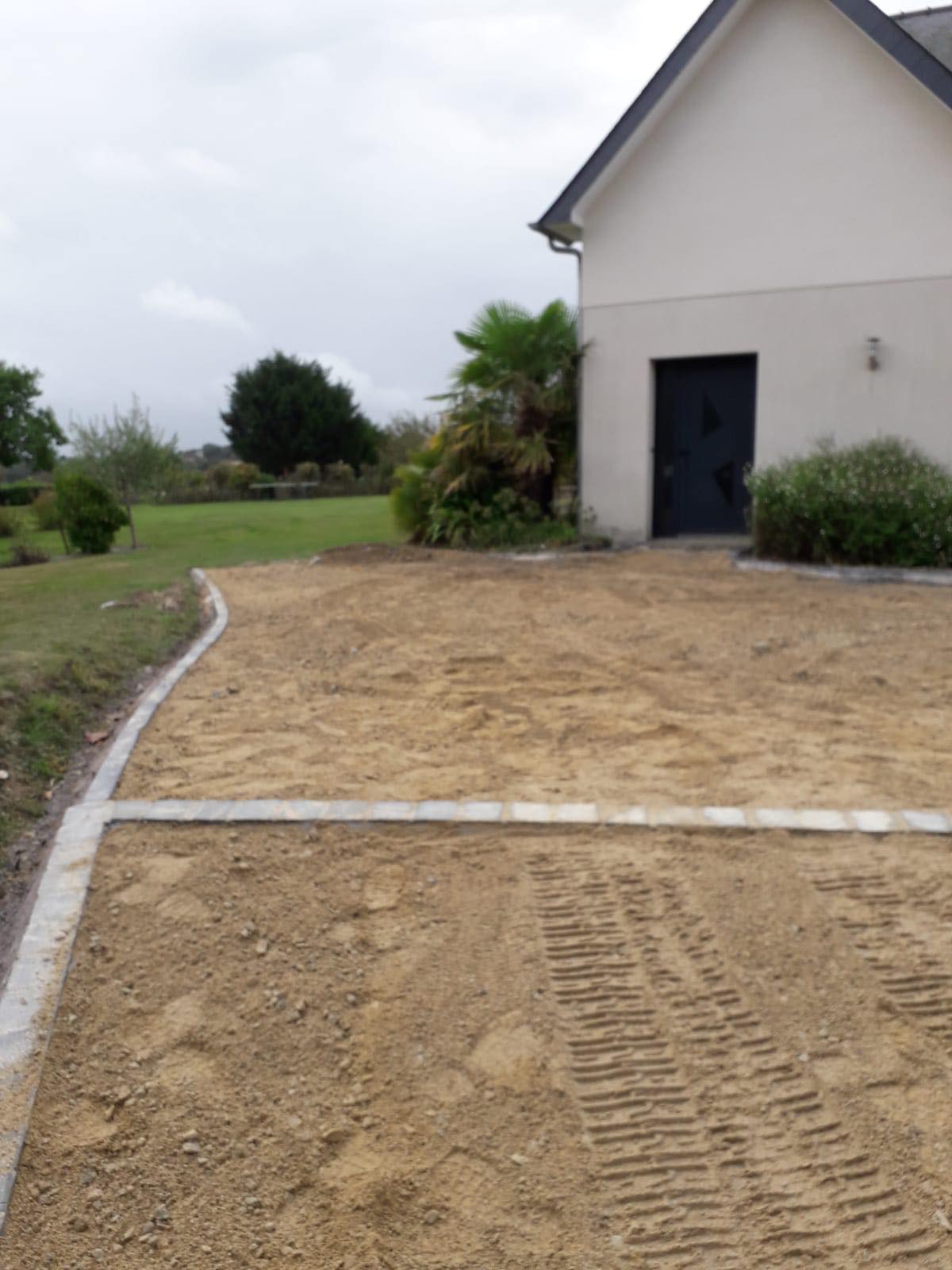Préparation du fond de forme d'une entrée de maison pour la pose de graviers et la mise en place de pas japonais.