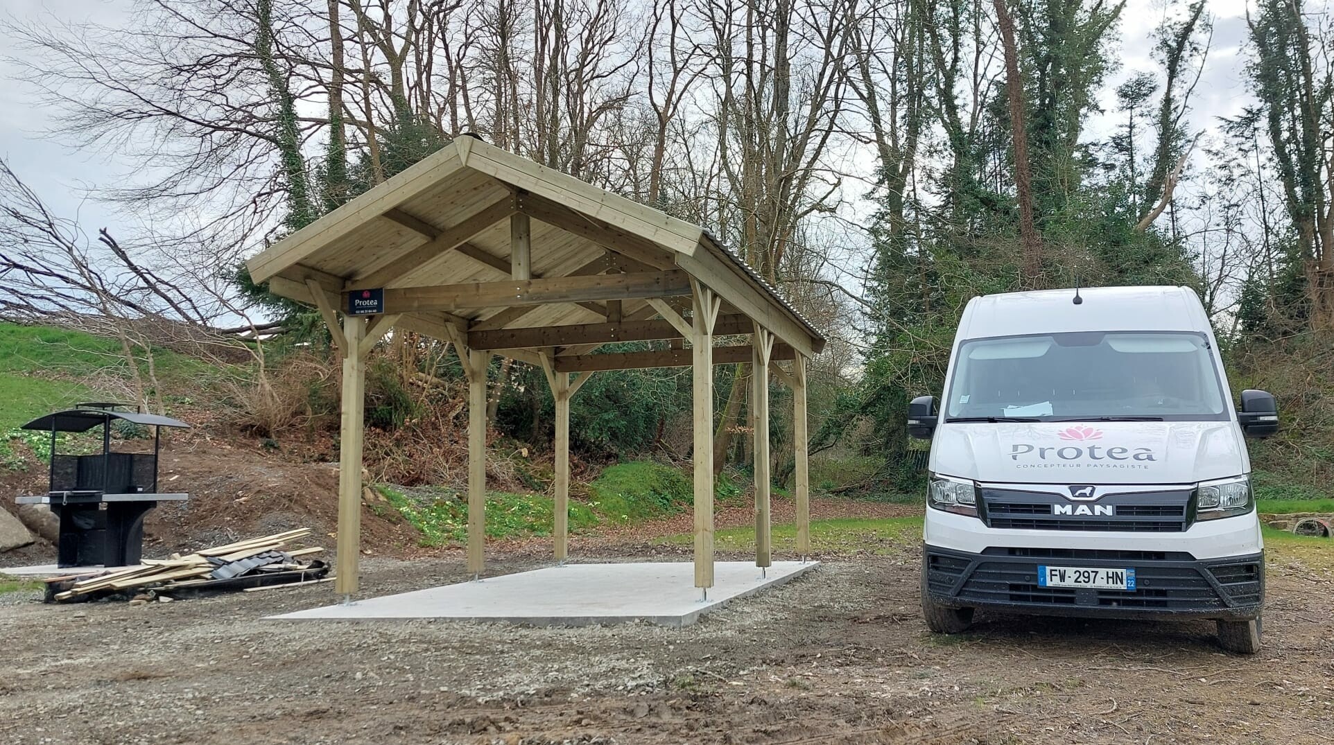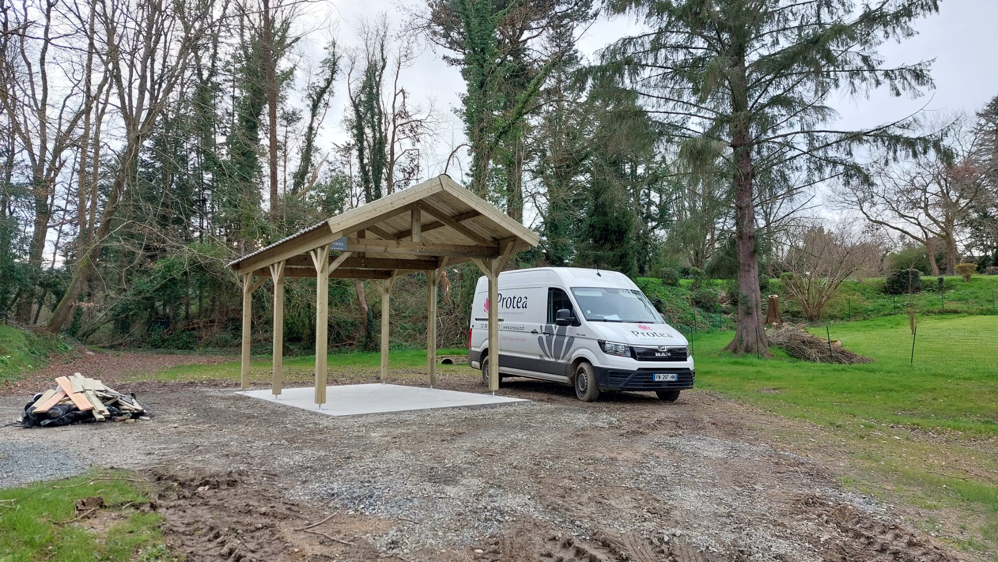 Protea Création, aménagement paysager - installation d'un carport en Pin à Vieux-Marché