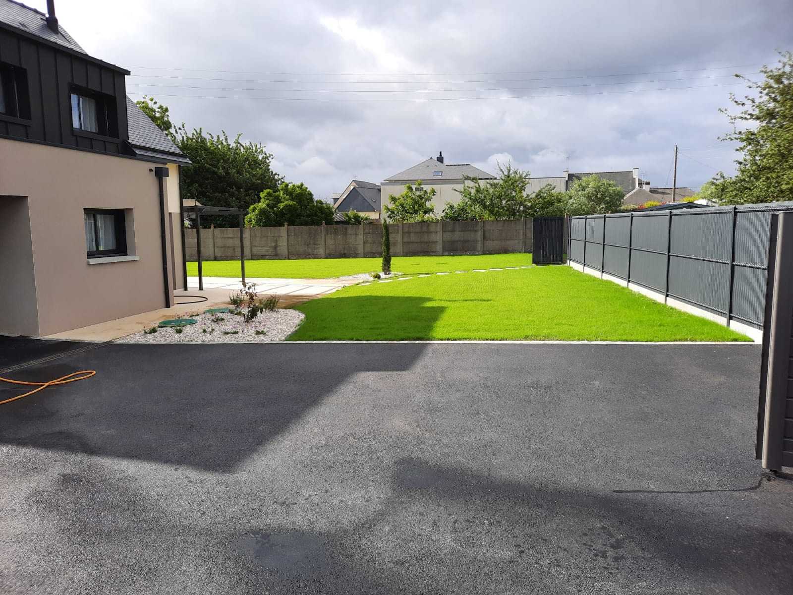 Chantier se situant à Pleurtuit, engazonnement , création de massifs avec plantations, chaînettes et pas japonais en gres d'Inde, pose de caniveaux et préparation enrobé