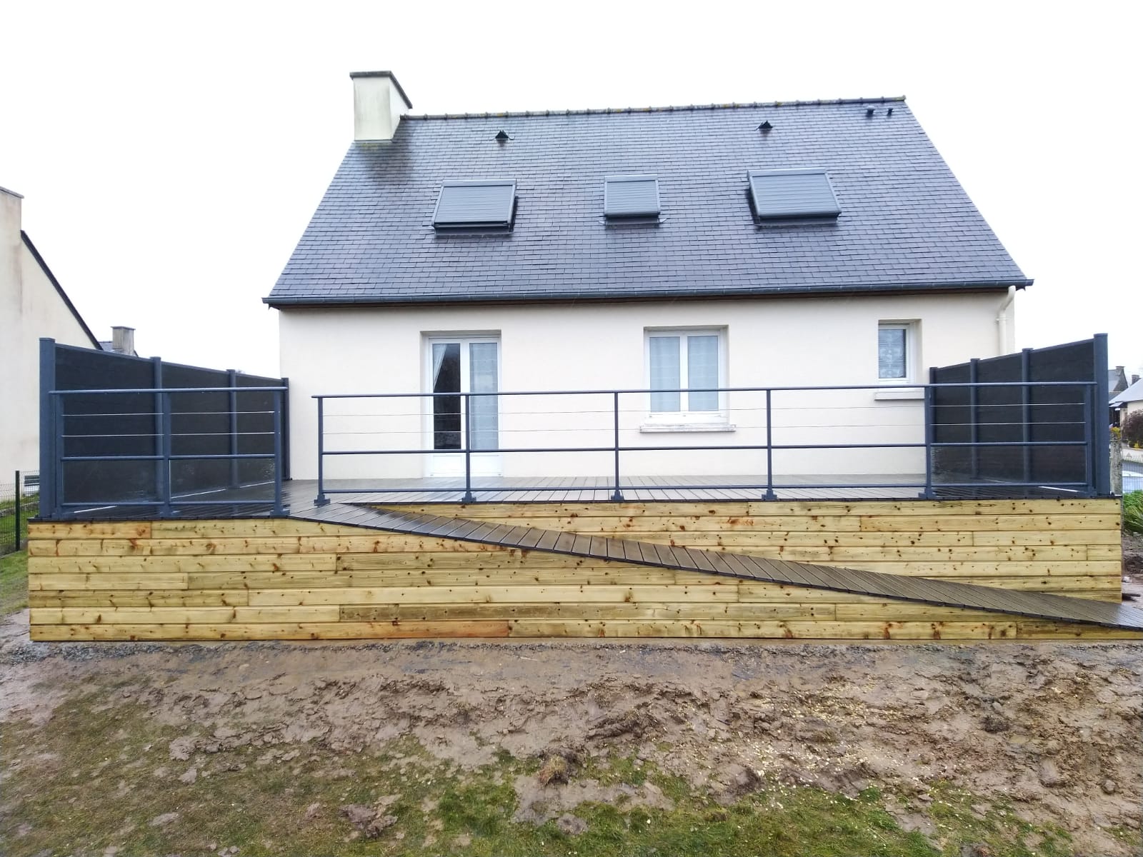 Terrasse en bois accessible par une rampe.