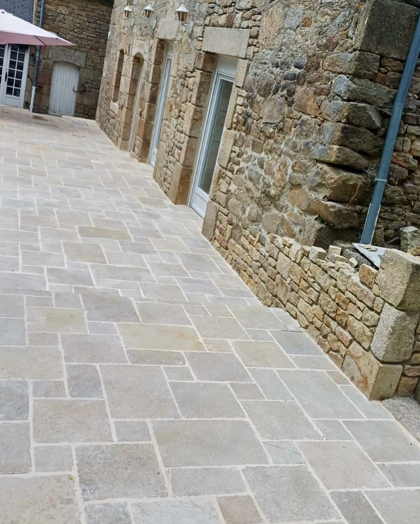 Lors d'un chantier réalisé à Saint-Lormel, en partenariat avec Sol Majeur Matériaux, nous avons posé une terrasse extérieure avec le matériau "calcaire Tandur beige".