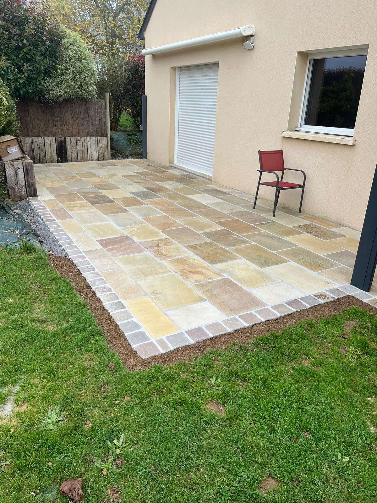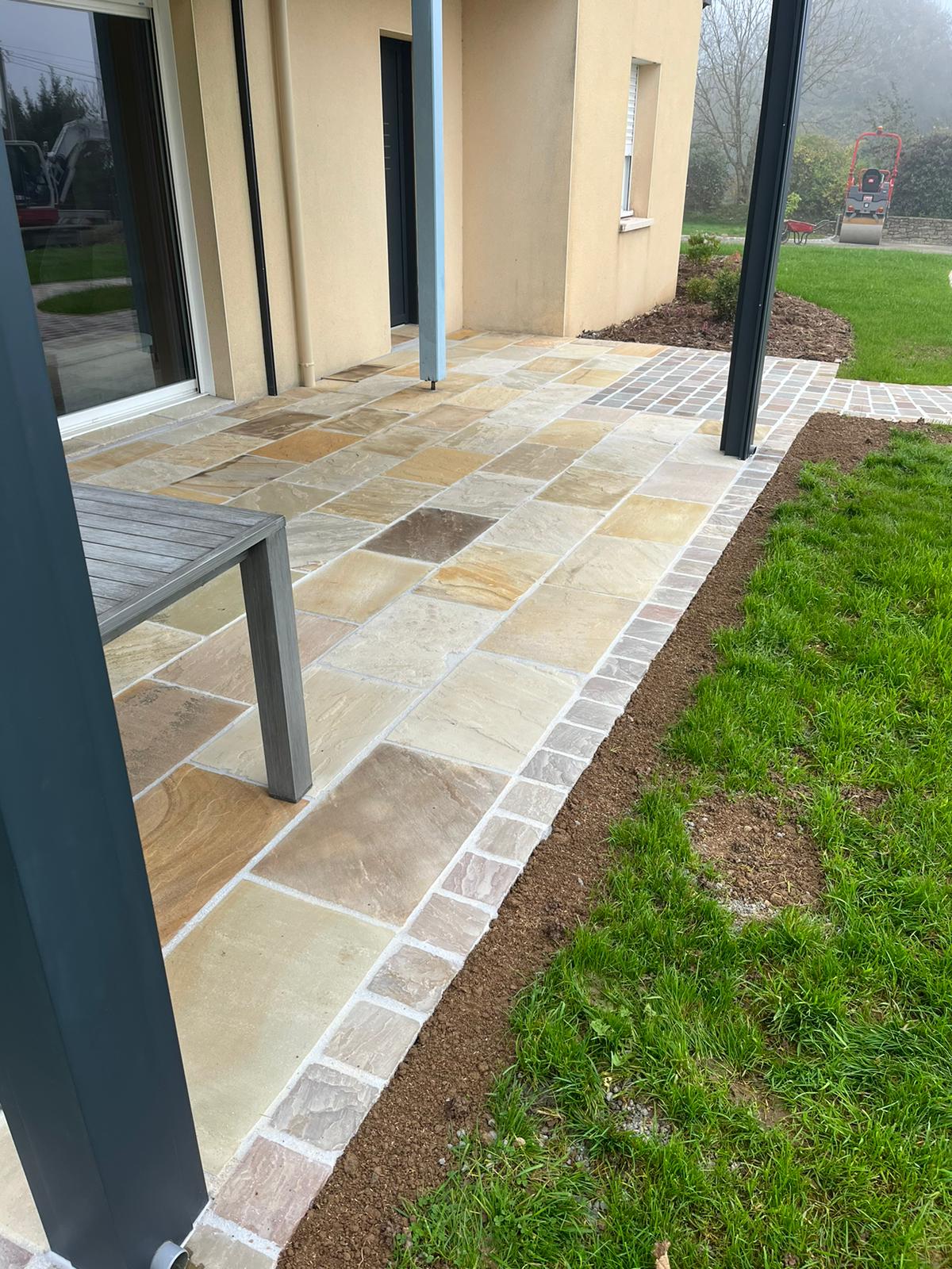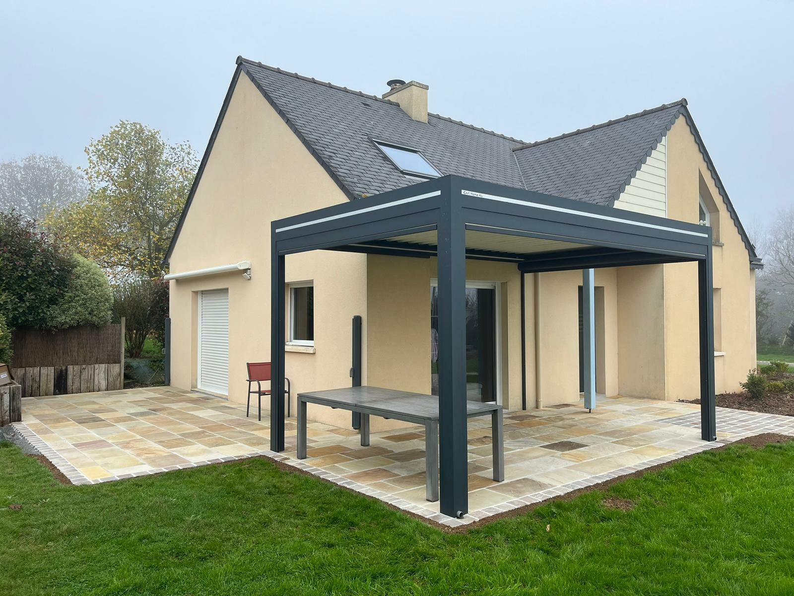 Réalisation d'une terrasse en pierre naturelle & pose pergola bioclimatique - Lamballe