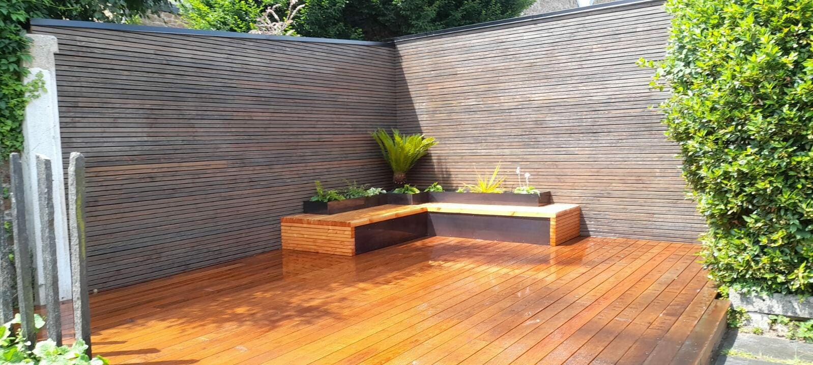 Rénovation de jardin avec mise en valeur d'un coin terrasse. Bardage bois, terrasse en bois et massif d'angle avec assises en douglas. Incorporation d'une lame d'eau dans la rénovation d'un massif existant.