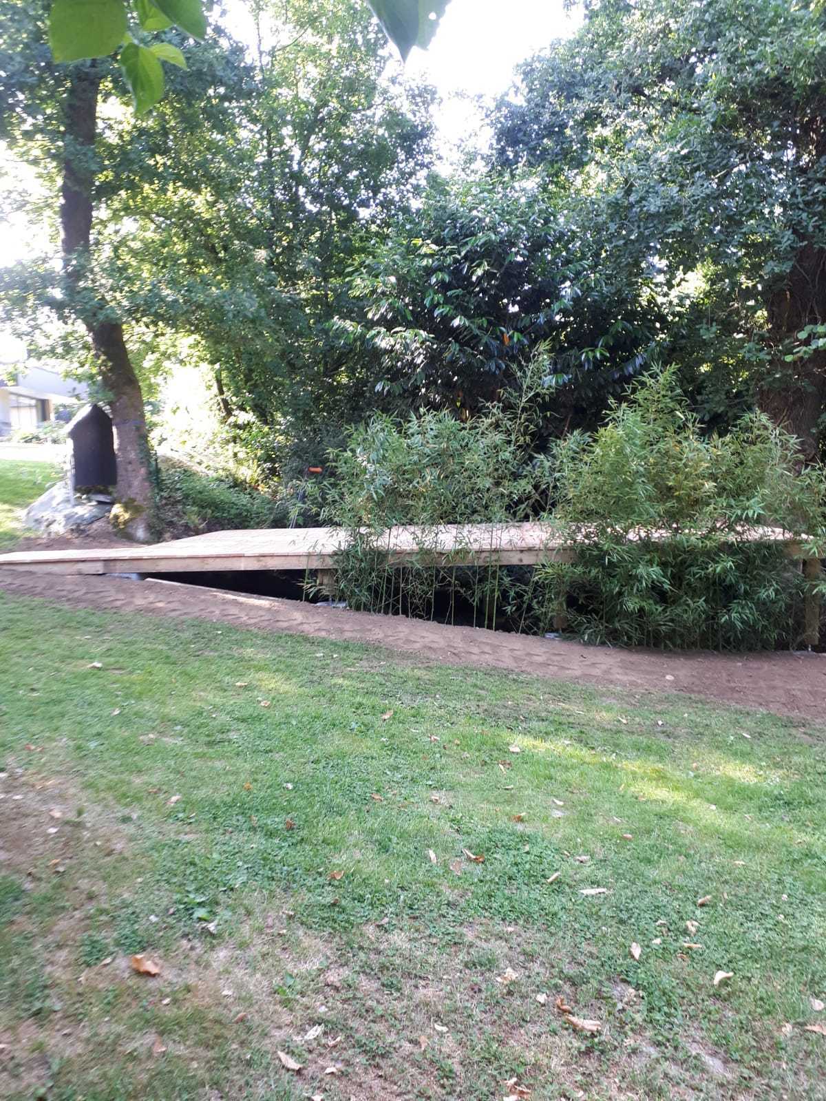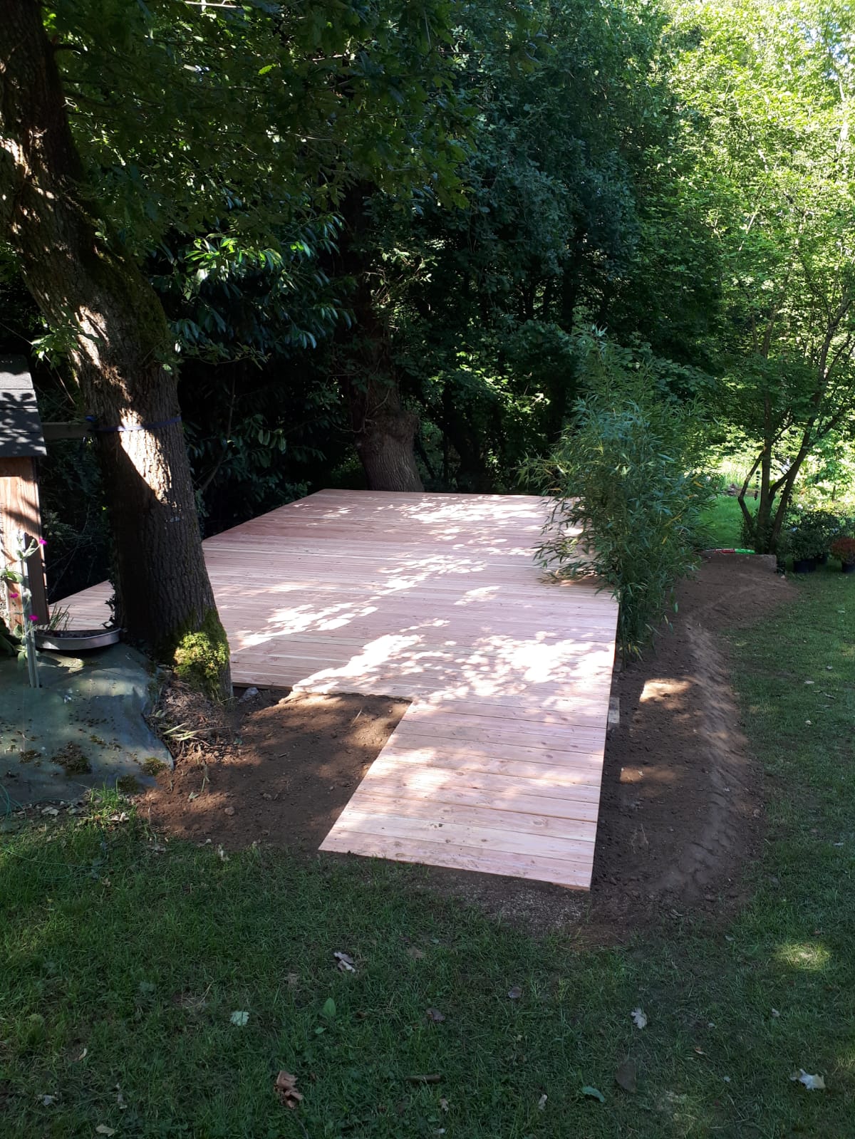 Plots béton, ossatures et platelage bois pour cette terrasse en fond de jardin