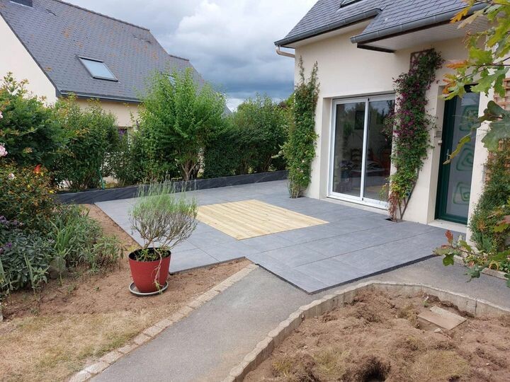 La conception d'une terrasse sur plots en grès cérame, agrémentée d'une partie centrale en pin, offre un mariage harmonieux entre élégance et authenticité. En complément, des retenues de terre en palis d'ardoise encadrent cette création, ajoutant une touche naturelle et distincte à l'ensemble.